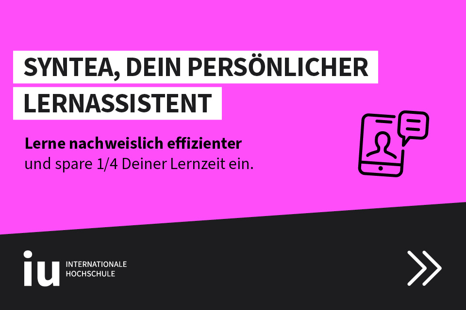 Die Theorie lernst Du zunächst eigenständig im Selbststudium mithilfe der abwechslungsreichen Lernmaterialien und der Lern-KI Syntea – ganz flexibel, wann es Dir am besten passt. Anschließend finden regelmäßig Begleitveranstaltungen in kleinen Gruppen vor Ort am Campus oder virtuell statt, um das Gelernte zu vertiefen und Fragen zu klären. Auf Deinem Weg zum erfolgreichen Studium unterstützen Dich die Studienberatung, Study Coaches und Career Coaches.