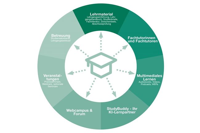 Die Fernlehrgänge des BTB sind von je her digital ausgerichtet: Studienbriefe als PDF, Online-Prüfungen und Online-Seminare sowie Webinare – fachbezogen und fachübergreifend – ermöglichen Studierenden eine flexible Gestaltung ihres Fernlehrgangs. Um Studierende optimal auf Prüfungen und ihre berufliche Zukunft vorzubereiten, erweitert das BTB kontinuierlich seine E-Learning-Angebote. Ein zentraler Bestandteil ist der KI-gestützte Lernpartner "StudyBuddy", der rund um die Uhr Fragen beantwortet, den Lernfortschritt überprüft und Inhalte vertieft.